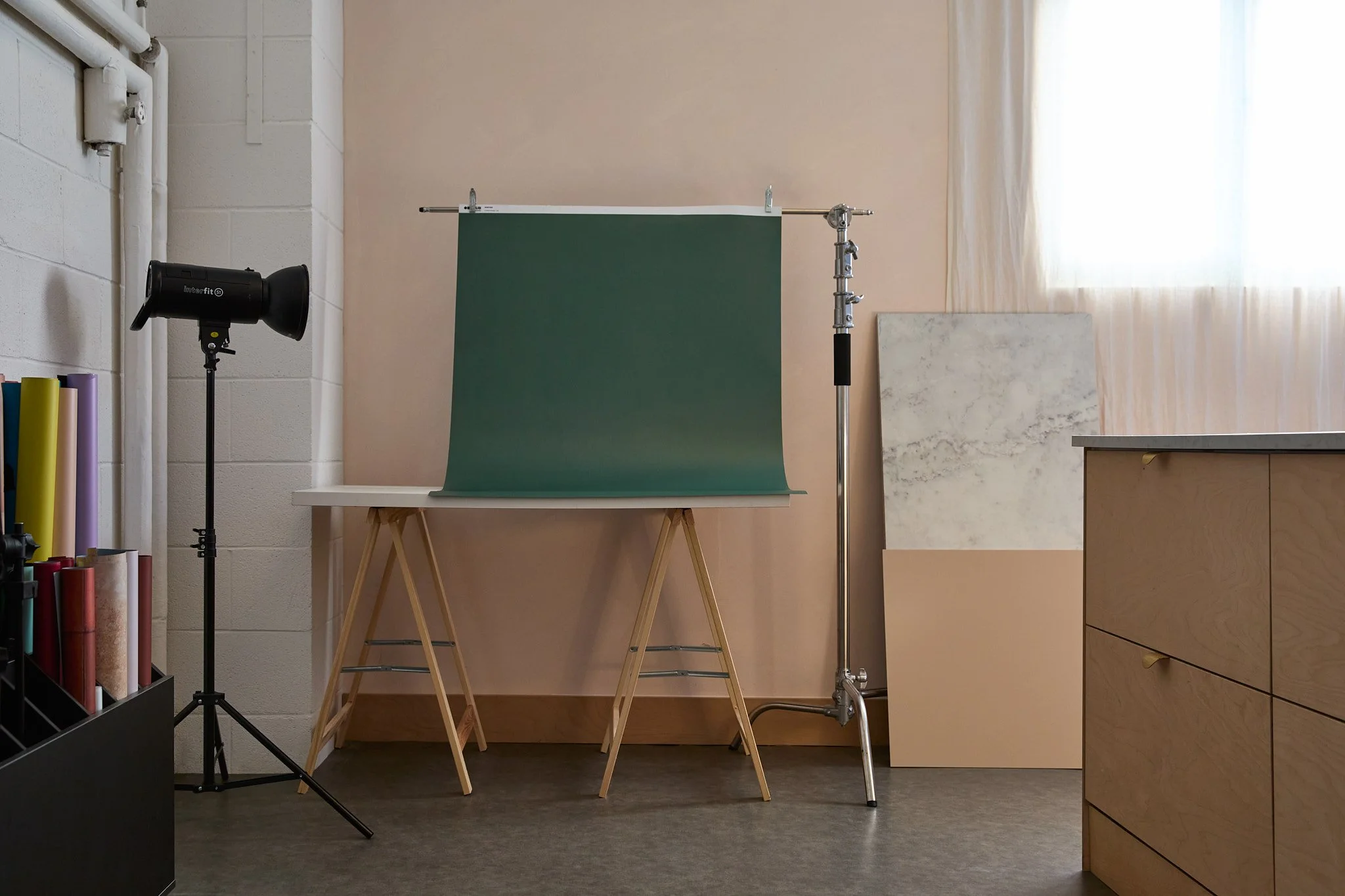 C-stands (+boom arm), backdrop stands, LED lighting panels, flash heads & relfectors / softboxes & trigger, V-Flat planels (like polys)